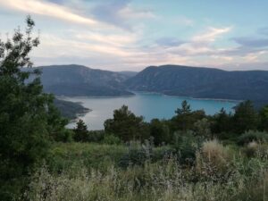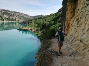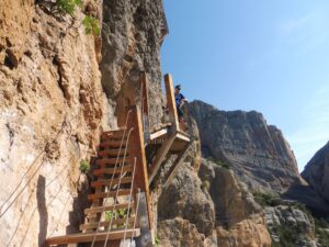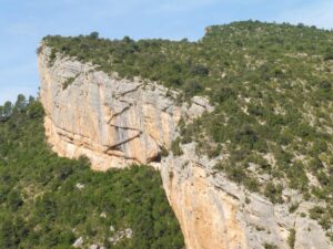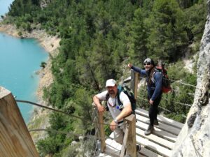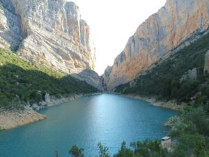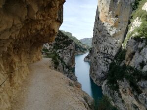 A la mañana siguiente descendimos por un camino muy claro por el bosque hacia el pantano de Canalles. Nos vamos acercando al paredón de Montfalcó hasta llegar a las pasarelas. Las pasarelas de Montfalcó son un paso artificial creado para unir Montfalcó con el congosto de Montrebei. Consta de dos tramos de pasarelas no aptos para personas con vértigo y un puente colgante. Tras cruzar el puente nos acercamos al congosto de Montrebei. El congosto es un camino horadado en la pared. Una vez que volvemos a bajar a la atura del embalse disfrutamos de un chapuzón y regresamos por el mismo camino. Por la tarde, con el coche, continuamos camino hacia el refugio de Vallferrera.
