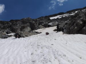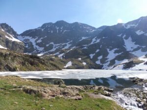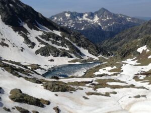 A la mañana siguiente, empezamos la ascensión a la Pica de Estats por la Canalbona hasta llegar al Estany de Sotllo. Reponemos fuerzas y continuamos hacia el Estany d'Estats. Aqui ya aparece la nieve, vamos esquivando los neveros. Poco antes del Port de Sotllo calzamos crampones. Descendemos unos 150 metros hacia la parte francesa y continuamos con la última subida hacia la Pica; últimas pendientes rocosas y ya se ve la cumbre, Pica d'Estats (Pico de los Estados) 3143 metros, techo provincial de Lleida y punto más alto de Cataluña. Vistas de todo el valle que hemos subido, con los dos estanys. Aprovechamos para subir también al vecino Pico de Verdaguer de 3131 metros. Larga subida, 1700 metros de desnivel positivo acumulado y 17 Km. en total, avituallando agua en un día largo y de mucho calor. Poco a poco por la Canalbona y después de 11 horas llegamos al refugio de Valferrera donde nos hidratamos a base cervezas en condiciones.