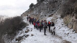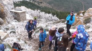 Una vez llegados a esta aldea abandonada, los más pequeños jugaron con el hielo de los charcos, muestra del frío que por allí reinaba. Luego comenzamos a subir y enseguida empezamos a pisar la pequeña capa de nieve caída en los días anteriores.
