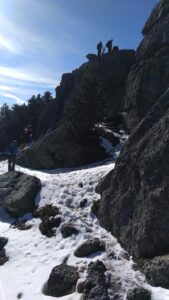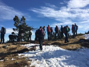 Retomamos la caminata, con nieve blanda, bajando hasta uno de los Hoyos de Iregua (hoy hemos estado en dos). Luego tras un fuerte repecho llegamos al cordal que nos llevaría hasta el pico del Buey. Un pequeño tentempié y la foto de grupo antes de bajar hasta nuestros coches.
