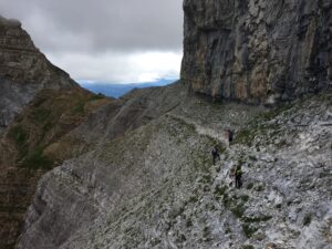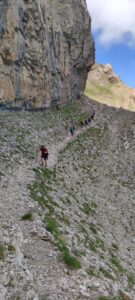 Retomamos la senda, prácticamente llana hasta llegar a la pared de Peña Parda donde se inicia un estrecho camino pedregoso, no apto para quienes tengan vértigo. Tras recorrerlo con cuidado llegamos a un punto donde tuvimos que echar las manos ocasionalmente para hacer una trepada sin apenas dificultad.