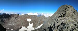 El tramo siguiente de la cresta es más evidente y rápido de recorrer, pasando por los picos Marcos Feliú o Punta de l´Ibón Chico (3.057m.), Pequeño Bachimala (3.061m.), y Pico del Ibón (3.100m.), disfrutando de unas vistas espectaculares hasta llegar a la Punta Ledormeur (3.120m.), desde donde destrepamos a la base del Gran Bachimala (3.177m.) para encarar la última trepada y completar así los ocho tresmiles de la cresta.