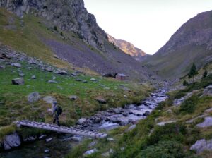 El descenso lo hacemos por la ruta que se dirige al Collado de la Señal de Viadós pero lo abandonamos para bajar al torrente de Bachimala que nos conduce al río Cinqueta , junto al pluviómetro que encontramos por la mañana subiendo al Puerto de La Pez, donde retomamos nuestro pasos mientras que se hace de noche.