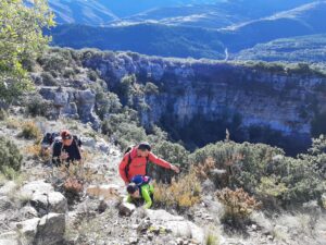 Un poco más tarde y después de un picoteo para cargar energía continuamos la subida por un camino empinado pero corto, llegando a la segunda dolina, un agujero, un circulo enorme casi perfecto (unos 200 m. de diámetro por unos 50 m. de profundidad) en medio del carrascal que nos hizo preguntarnos como pudieron formarse esos enormes hoyos… hundimientos del terreno… meteoritos…
