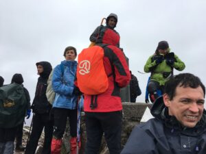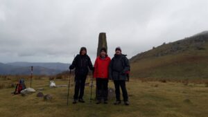 Seguimos caminando con la lluvia intermitente, siempre fina y sin viento, hasta encaramar el Adarra pasando antes por restos de construcciones funerarias megalíticas. En la cuesta final, quizo aparecer la niebla que rápidamente se escapó al vernos pero el viento gélido hizo su presencia pero no nos impidió llegar a la cima que se encuentra a 819 mts. y desde aquí divisamos el mar Cantábrico. Tras las fotos de rigor, no en grupo puesto que apenas cabíamos todos, empezamos la bajada que más de uno se empeñó en hacerla casi rodando o deslizándose con el culo gracias al barro y a la húmeda hierba.