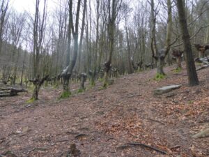 Atravesamos el pueblo por la vía verde y continuamos por ella un trecho hasta un punto que la abandonamos y nuestros pies al fin pisaron senda. Nos metimos en bosque y rápidamente nos dimos cuenta que el barro sería una compañía que no nos abandonará durante la ruta. Estuvimos ascendiendo en medio de grandes hayas, pinos y otros árboles que deleitaban nuestros sentidos. De vez en cuando, una parada para reagruparnos y echar un bocado, pequeño que hay que dejar hueco al chuletón, y después de algo más de una hora de caminata ya empezaron a caer las primeras gotas de fina lluvia.