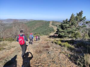 Después de la foto de cumbre de rigor, comenzamos el descenso por un cortafuegos que nos lleva a una pista que seguimos durante unos 500 metros antes de afrontar el tramo más exigente de la excursión de hoy: una estrecha senda por un empinado cortafuegos que en un par de kilómetros nos lleva al camino por el que hemos empezado a caminar por la mañana, ya muy cerca de los coches.