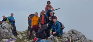 Al acercarnos a su cima hace aparición el sol por única vez en toda la jornada. Tras hacer las fotos de rigor comenzamos el descenso hacia el Santuario de San Miguel de Aralar, semioculto entre las nubes. Visita al histórico santuario navarro y almuerzo en su acogedor refugio/bar. Con las pilas cargadas, buscamos el sendero, pendiente y resbaladizo, que nos baja hasta la pista inicial a la orilla del río. Cerca de las 4 de la tarde llegamos a Irañeta después de 16 kilómetros y casi 1000 metros de desnivel.