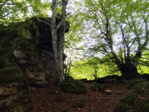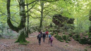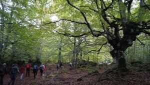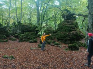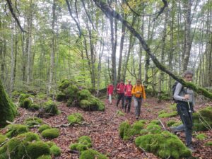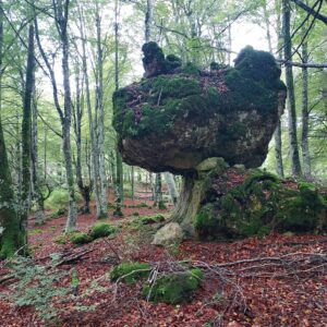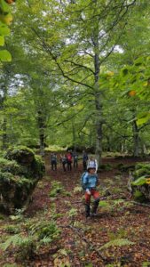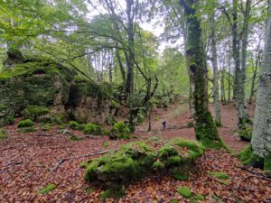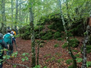 Pocos pasos sirvieron para darnos cuenta de la maravilla del entorno. Nos adentramos en bosques de hayas, alerces y otros ejemplares de gran tamaño aún vestidos de hojas que se resistían a tornarse a colores otoñales. En cambio nuestros pies caminaban al lado de decenas, cientos, de setas de diversos tamaños y colores que sí nos gritaban que el otoño había llegado.