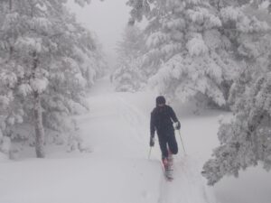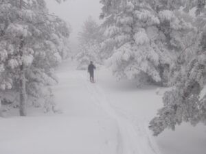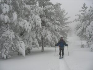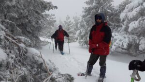 Sin pereza alguna una vez arribados en nuestro destino, cada uno se calzó sus herramientas ( 3 con raquetas y dos con esquís ) y encaramos las primeras rampas hacia el Buey gozando de un estupendo paisaje de pinos doblegados por el manto de nieve recién caída.