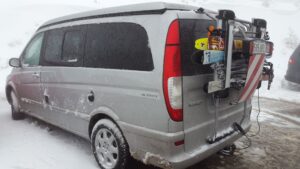En Villoslada apenas había nieve, con lo cual, desafiando nuevamente las condiciones, nos dirigimos al punto de nieve de Santa Inés al que conseguimos llegar casi de forma milagrosa después de tropezarnos a la Guardia Civil que nos remendó encender las luces en un día "así", suerte que no se percató de los tres osos que iban sin atar en el asiendo trasero de la furgoneta donde sólo pueden ir dos, ya que no sólo desafiamos las condiciones sino también la legalidad.