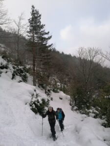 El domingo, después de desayunar y recoger todo en los coches, salimos a las 9 en la misma dirección que el día anterior hasta llegar al cruce hacia Agüerri, que es el que tomamos. El sol luce espléndido y, al no haber viento, aunque la temperatura es baja, la sensación térmica no es de frío. La nieve está también virgen y vamos dejando nuestra huella dibujada. Tras varias horas andando subimos en zig-zag por una ladera con bastante esfuerzo. Ya en horizontal, hay una zona de la ladera un poco más helada que hay que pasar con cuidado. Tres personas del grupo deciden regresar antes a Gabardito; los demás seguimos. Enseguida llegamos al refugio de Taxeras, a 1782 m. Allí paramos a almorzar. Acordamos seguir un poco más intentando estar de vuelta antes de las 13 ó 13,30 horas. Seguimos subiendo hasta que vemos el refugio de Secús y el circo que hay al fondo y nos volvemos por el mismo camino, esta vez con el piolet en mano para cruzar la zona con más riesgo. Antes de las 4 estamos en los coches, quedándose unos a comer algo allí y partiendo los otros ya a Logroño de vuelta. Este segundo día recorrimos unos 12 km y 512 m de desnivel.