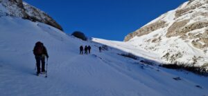 Llega el momento de decidir por donde subir al pico la Miel, y todavía resulta difícil de creer que nos pusiéramos de acuerdo en subir por la primera canal a pesar de su fuerte pendiente, que gracias al coraje del grupo se sorteó sin gran dificultad , pero no libre de algún susto.