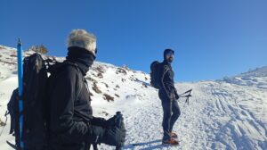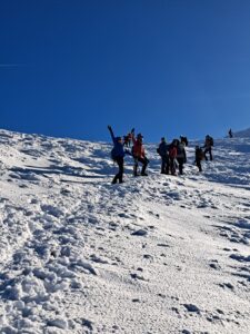 Iniciamos la subida por la pista que se denomina El Camino que poco a poco nos fue alejando de la estación. El ritmo era tranquilo pero constante, compartiendo conversaciones, bajo un cielo encapotado con nubes bajas. Poco antes de subir al collado de Turraguas, decidimos ponernos los crampones, la nieve estaba dura y siempre hay que primar la seguridad.
