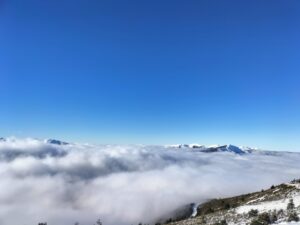 Tras este corto pero duro repecho, alcanzamos una senda que nos llevaría hasta la parte alta de Colocobia, pasando por debajo del cerro de igual nombre, momento donde atravesamos las nubes para dejarlas bajo nuestros pies y disfrutar de unas estupendas vistas de las cumbres de la sierra de la Demanda.