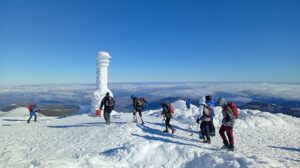 Ya nos quedaba el repecho final, con una pendiente pronunciada y fuertes rachas de gélido viento, de ese que te entra hasta los huesos, y con un ritmo constante llegamos al techo de La Rioja, el San Lorenzo o Cuculla. Las estatuas allí instaladas estaban cubiertas totalmente con una espesa capa de hielo.