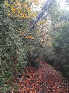 Comenzamos a caminar por la ruta del agua, que tanto tirón tiene en esta zona, para luego abandonarla y proseguir senda arriba por preciosos bosques cuando empezaron a caer algunas gotas de lluvia.